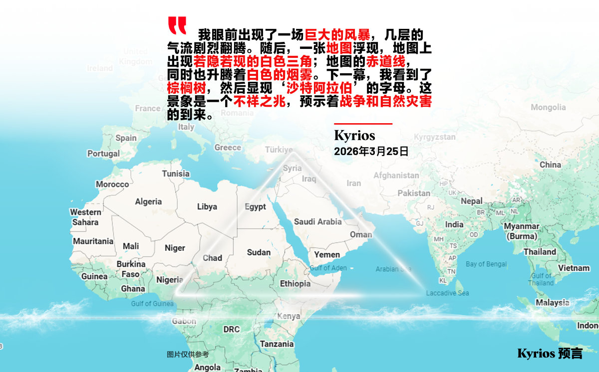 我眼前出现了一场巨大的风暴,几层的气流剧烈翻腾。随后,一张地图浮现,地图上出现若隐着现的白色三角;地图的赤道线,同时也升腾着自色的烟雾。下一幕,我看到了棕榈树,然后显现“莎特阿拉伯’的字母。这景象是一个不祥之兆,预示着战争和自然灾害的到来。—Kyrios